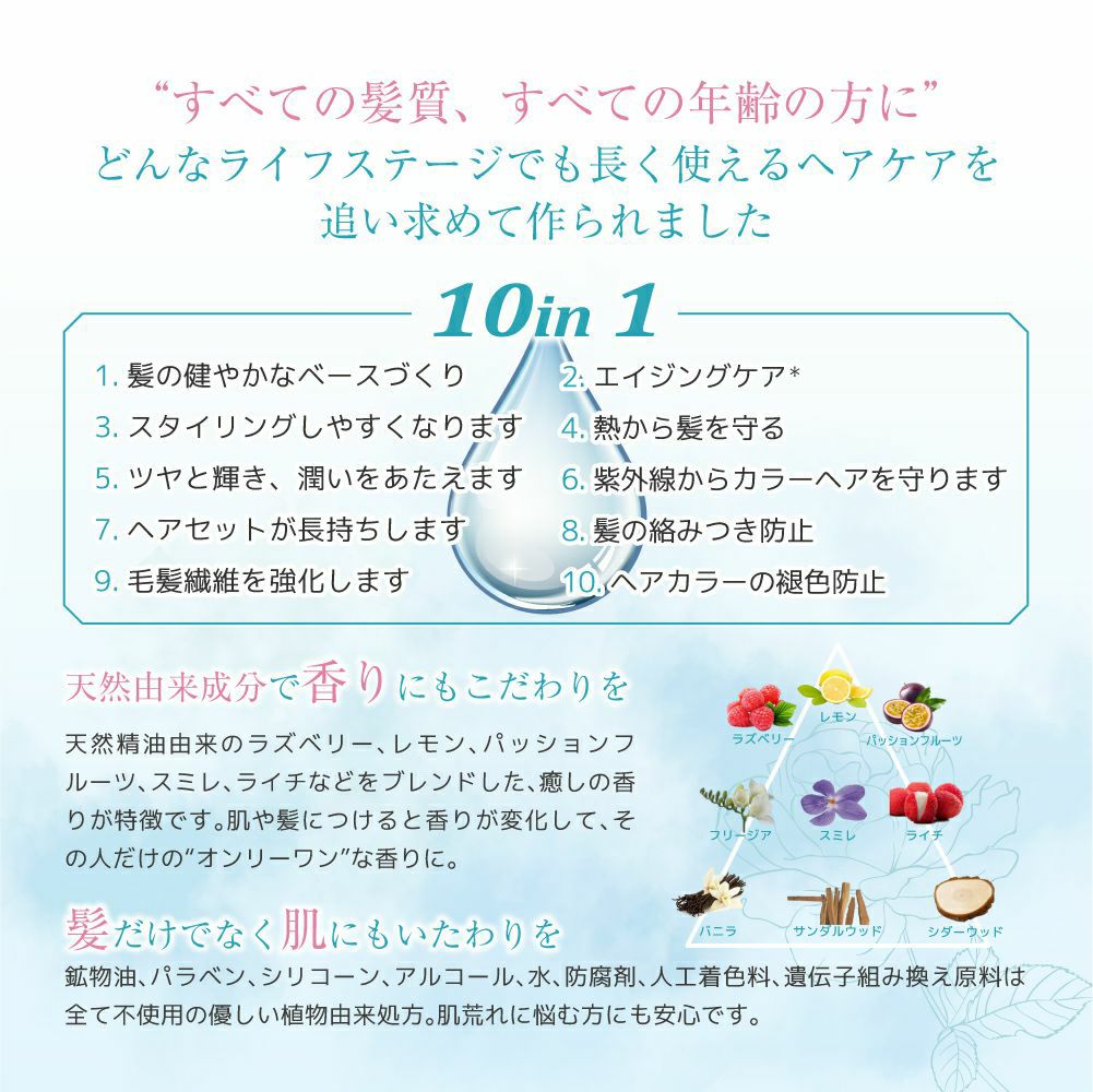 水、セテアリルアルコール、ミリスチルアルコール、ベヘントリモニウムクロリド、セトリモニウムクロリド、アルガニアスピノサ核油、ツバキ種子油、クコ果実エキス、アスパラサスリネアリス葉/茎エキス、アルギニンHCl、トレオニン、セリン、アルギニン、コムギアミノ酸、ダイズアミノ酸、パンテノール、グリセリン、トリ(カプリル酸/カプリン酸)グリセリル、ダイマージリノール酸ダイマージリノレイル、クエン酸、乳酸、EDTA-2Na、レシチン、α-イソメチルイオノン、ポリクオタニウム-70、シトロネロール、リモネン、ゲラニオール、イソプロパノール、PG、DPG、グアーヒドロキシプロピルトリモニウムクロリド、BHT、オキシベンゾン-4、メチルイソチアゾリノン、トコフェロール、香料、ステアリン酸PEG-20、フェノキシエタノール、パルミチン酸アスコルビル、ソルビン酸K、安息香酸Na、ソルビン酸
